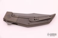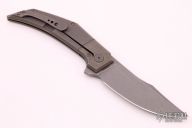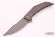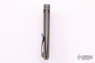 This Xerxes by Dutch Blade Works is a Tashi Bharucha and Gudy Van Poppel design. It features a stonewashed blade with false top edge and flipper. The handle has a tumbled and anodized titanium frame with milling pattern with a matching tapered backspacer and tip up clip. Rides on ceramic bearings and detent. Has a stainless lockface insert with overtravel stop. Has a few light scuffs, otherwise excellent condition.