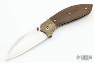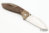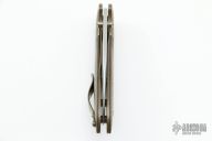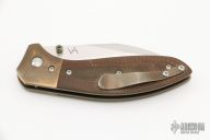 This Mini Odin by Simon V Anderson features a hand rub satin finished sheepsfoot/wharncliffe blade with dual thumbstuds with ceramic ball inlays. The handle has orange peel finished bronze bolsters, anodized titanium liners, brown canvas micarta scales, tip up anodized titanium clip. Nice detent, lockup and blade seating. Has some light scuffs, otherwise excellent condition.