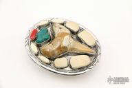 This belt buckle by Joe Scherhaufer is made of sterling silver with Narwhal ivory, turquoise and sharks tooth inlays. Would take a 1.5" Belt. New from maker.