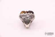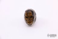 This Ring by Joe Scherhaufer is made of Sterling Silver and has a tiger eye stone inlay carved into a skull. Has engraved Harley-Davidson Motor Cycles on both sides. Size 12. New from maker.
