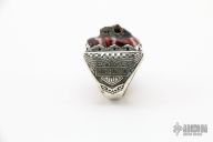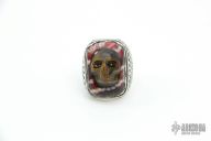 This Ring by Joe Scherhaufer is made of Sterling Silver, mammoth tooth and has a tiger eye stone inlay carved into a skull. Has engraved Harley-Davidson Motor Cycles on both sides. Size 13.5. New from maker.