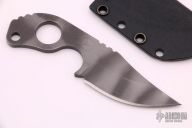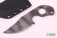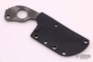 This Triple Aught Design SLCC by Mick Strider features a tiger striped upswept blade with a notched thumbrest, .194" blade stock and 1.375" blade depth. The handle has a finger groove and ring. Comes with a kydex sheath. Has some scratches, otherwise excellent condition.