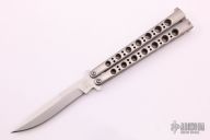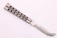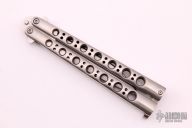 This Model 42 Balisong by Benchmade features a satin finished blade with swedge. The handle is comprised of integral skeletonized titanium handles with T latch on pommel. Has a couple light scratches, has been resharpened, otherwise excellent condition.