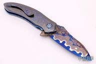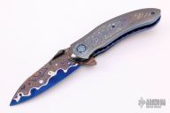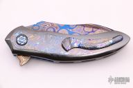 This knife by Peter Martin features a Hot Blued Sole Authorship Lava Lamp San Mai Damascus blade with zirconium thumblug and a flipper. The handle has zirconium scales with zircuti inlays, anodized/jeweled titanium liners, matching San Mai Damascus backspacer, and a tip up zircuti clip with hidden screws, anodized titanium screws and pivot with zirconium pivot collars. Martin is signed on the inside of the backspacer.  Nice detent, lockup and blade seating. Includes a padded zippered case.  Excellent Condition.