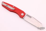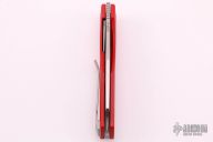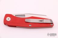 This Axon First Run Folder by Vero Engineering features a satin finished blade with notched thumbrest and thumbhole. The handle has red G10 scales with inlaid liner, tip up titanium clip with hidden screws, titanium backspacer. Rides on bearings, nice detent, lockup and blade seating. Comes with zippered case and COA #314. Has a couple light scratches, otherwise excellent condition.