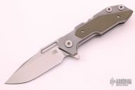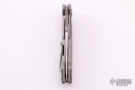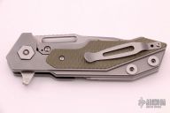 This Fulltrack flipper from Rick Hinderer Knives was just released at the 2018 Blade Show and this is the quite possibly the coolest design we've seen since the XM-18! This one features a working finished, spear point shaped blade with notched thumbrest and flipper. The handle has a tumbled finished titanium with green G-10 scales that can be removed to reveal a hidden pocket/storage area that was designed to hold additional pivot washers. This entire knife can be field stripped using a tool that rests between the handle scales. The tool has a spring that holds the tool between the standoffs. Come with Tri-Pivot system. Excellent Condition.