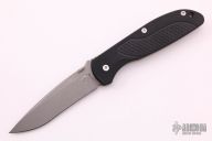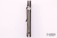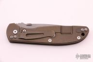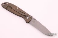 This Firetac by Hinderer features a working finished recurve blade. The frame and the blade both have a working finish. The handle consists of textured black G-10 and battle bronze frame. The pocket clip is reversible. The thumbdisc is removable; there is a lanyard hole at the bottom. Has some light oxidation on the blade and thumbdisc, otherwise excellent condition. Comes with original box and extra hardware.