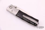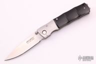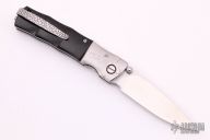 This liner lock features ebony wood scales that are in the shape of bamboo. Damascus bolsters and a satin finish blade. Dual thumb studs and hammered finish pocket clip. Strong lock up, nice detent and blade seating is center. Includes a sheath. Nice Work. Has a few light scratches, otherwise excellent condition.