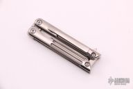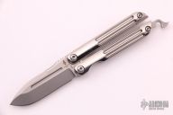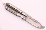 This miniature Balisong by Terrain 365 and Darriel Caston features a drop point blade with a false top edge. The handles are composed of mirror polish titanium. Comes with hard plastic case. Has some light scuffs and scratches, otherwise excellent condition.