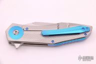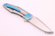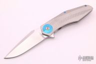 This Accomplice flipper from Steven Skiff features a hand rub satin finished blade with false top edge, notched thumbrest and flipper. The handle has a milled titanium frame with anodized titanium pivot collars, tip up clip and backspacer. Very smooth action with a nice detent, lockup and blade seating. Includes a zippered case. Excellent condition. #114 inside frame.