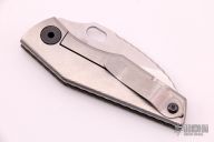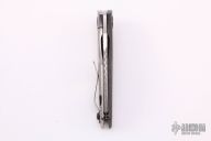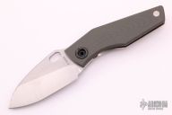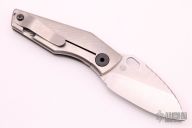 This SJ75 Baby Huey framelock folder by Strider Knives has a tumble finished blade and a green G10 and milled titanium frame with tumbled tip up titanium clip. File work on blade spine and inner edges of frame along the spine. Has scratches on the clip, otherwise excellent condition. Nice detent, lockup and blade seating.