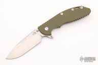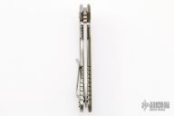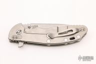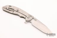 This Skinny XM-24 by Hinderer Knives features a stonewashed drop point blade with notched thumbrest and flipper. The handle has a textured G-10 scale with tumbled titanium liner and frame, tip up or down reversible titanium clip. Includes Hinderer titanium standoffs, bolts, screws, pivot and pocket clip. Nice detent, lockup and blade seating. Excellent condition. Includes the original box and papers.