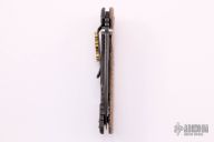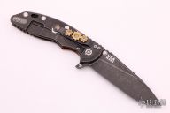 This XM-18 Skinny by Rick Hinderer features a Battle Black finished no choli Slicer blade with notched thumbrest and flipper. The handle has a custom micarta front scale, battle black finished titanium frame, and a tip up or down reversible flamed finished titanium clip with brass gears and a filler tab, lanyard hole at the butt. Comes with original box and extra hardware, comes with original black G-10 scale. Excellent condition.