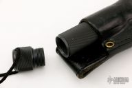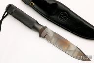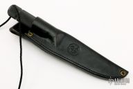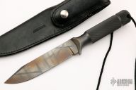 The Mountaineer I by Chris Reeve was designed to incorporate the two basic criteria required in knives destined for hard field usage, these clip-points have plenty of blade weight and good strong points. This design has been used by soldiers all over the world who have found them to be extremely good weapons as well as rugged dependable tools. It features a clip point blade with false top edge, .197" blade stock and 1.165" blade depth, integral construction with a hollow knurled handle, aluminum butt cap. The blade has a camo coating, this is an aftermarket coating. Comes with original black leather sheath by Gfeller Casemakers. Has a couple light scuffs, otherwise excellent condition.