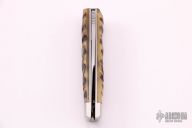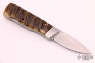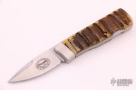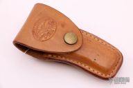 This Benchmark Rolox Viper Sheep Horn is a very rare slide back "folder". The design is simple yet effective. Feature stainless steel bolsters, liners and lockbar with beautiful sheep horn scales that contour nicely to your hand. You push down on the back of the thumb notches of the blade to release and slide it forward into position. Very neat design. Comes with brown leather case with snap and belt loop. This knife has a few light scratches, otherwise excellent condition.