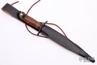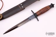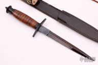 This is a copy of the famous Case V42 dagger made for the First Special Service Force [ FSSF ] the famous " Devil's Brigade " during World War Two. It is made by H.G. Long & Co. of Sheffield, England and sold by the EK Commando Knife Company. Has a black double edged blade with .181" blade stock and .742" blade depth, hidden tang construction. The handle has a black guard and butt with stacked leather and brass grip. Comes with original brown leather sheath. Has some minor wear, otherwise excellent condition.