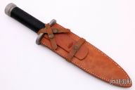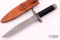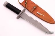 This knife by Mike England features a bead blasted blade with sawteeth on the spine and sharpened top edge, .257" blade stock and 1.449" blade depth. The has a bead blasted stainless steel guard welded to a hollow stainless steel handle with black nylon cord wrap, has removable bead blasted aluminum butt cap with compass. Comes with brown leather sheath with an EZE-LAP sharpening stone. Excellent condition.