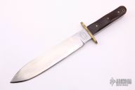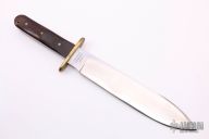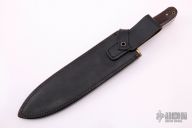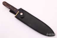 Heavy duty camp knife made by Seki-Cut in Japan for Blackjack. Full tang construction with 1/4" blade stock and 1 3/4" depth. Cocobolo scales with brass guard and pins. Comes with a black leather sheath. Knife is in good condition; a bit of oxidation on the blade and has a few light scratches.