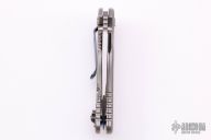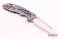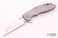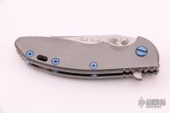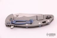 This Custom XM-18 by Rick Hinderer features a satin finished wharncliffe blade with notched thumbrest and flipper. The handle has a bead blasted titanium scale, stonewashed titanium liner and frame, anodized and stonewashed titanium clip, lanyard hole at the butt, Steel Flame skull filler tab, anodized titanium pivot and screws. Nice detent, lockup and blade seating. Comes with original box. Has a light scratch on the front scale and a mark on the pivot screw, otherwise excellent condition. Originally from the 2017 USN Lottery.