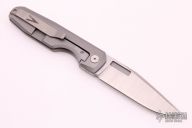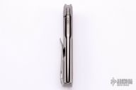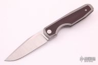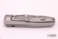 This Isotope by Vero Engineering features a belt satin finished blade with notched thumbrest and flipper. The handle has a tumbled titanium frame with red/black carbon fiber inlay, satin titanium hardware, tumbled titanium tip up clip. Nice detent, lockup and blade seating. Comes with a zippered case and COA. Has a couple light scratches, otherwise excellent condition. #065.
