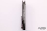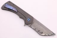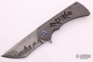 This Honor Tanto Flipper from Rick Barrett is marked Proto 2 of 2 inside the backspacer. It has a very cool San Mai Damascus tanto recurve blade with notched flipper. The handle has a heavy tumbled titanium frame with "HONOR" in Japanese characters, tip up mokuti clip, over an anodized titanium backspacer. The blade is centered when closed and flips open with no wrist action needed. Nice detent, lockup and blade seating. Comes with a zippered case. Excellent/new condition.