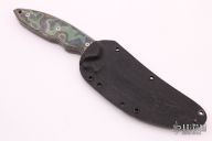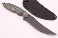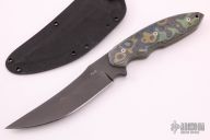 This Persian Fighter by Jeff Hall features a black blade with notched thumbrest, .213" blade stock and 1.349" blade depth, full tang construction with multi-color micarta scales. Comes with a kydex sheath. Excellent condition.
