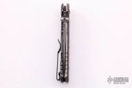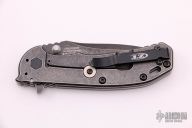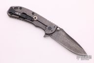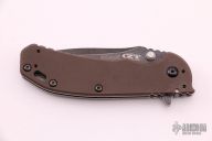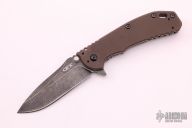 This 0566 Hinder Design Flipper by Zero Tolerance features a dark tumble finished drop point blade with swedge, dual thumb studs, notched thumb rest and flipper. The handle has a flat dark earth G-10 scale over a stainless steel liner and a dark tumbled titanium lockside over black barrel spacers. The black coated steel tip up clip is reversible for right or left hand carry. S/N 0234.  Has some light scuffs, otherwise excellent condition.