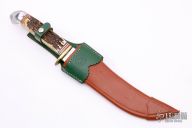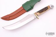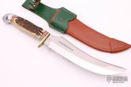 This Original Buffalo Skinner by F.A. Bower Imp. Co. features a mirror polished blade with false top edge and notched thumbrest, .216" blade stock and 1.784" blade depth, full tang construction. The handle has a brass guard, aluminum butt, stag scales and red/white spacers. Comes with original leather sheath. The scales have separated slightly from the tang, otherwise excellent condition. #48 on the blade.
