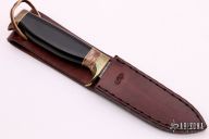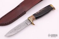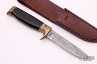 This knife by Howling Wind Forge features a Damascus blade with .149" blade stock and .826" blade depth, hidden tang construction. The handle has a brass guard and butt with buffalo horn grip and white and maple spacers. Comes with a brown leather sheath and zippered case. Excellent condition.