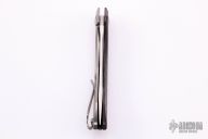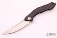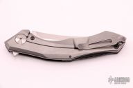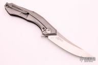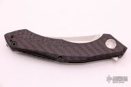 This 0462 Sinkevich Design flipper by Zero Tolerance features a satin finished upswept blade with flipper and swedge. The handle has a red/black carbon fiber and tumbled titanium frame, black aluminum backspacer and a tip up reversible titanium clip. Nice detent, lockup and blade seating, rides on bearings. Has stainless steel lockface insert and overtravel stop, ceramic detent ball. S/N 7847. Excellent condition.
