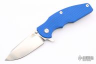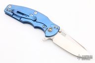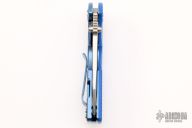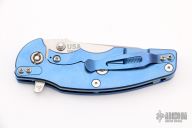 This Jurassic by Hinderer Knives features a stonewashed clip point blade with notched thumbrest and flipper. The handle has a stonewashed and blue anodized titanium frame with a blue G-10 scale, tip up or down reversible clip and a modular backspacer. Nice detent, lockup and blade seating. This knife has the Tri-Way pivot system. Comes with original box. Excellent condition.
