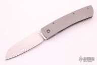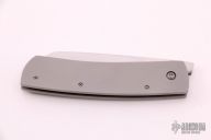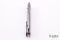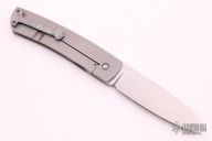 This framelock by Stephane Espi features a hand rub satin finished blade with notched thumbrest. The handle has a bead blasted titanium frame with tip up Damasteel clip. Nice detent, lockup and blade seating. Excellent condition.