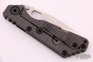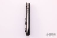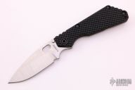 This SNG framelock folder by Mick Strider features a stonewashed blade and a dimple pattern black G-10 and flamed titanium frame and tip up titanium clip. Includes a "Lock Bar Stabilizer" for maximum reverse lock retention. Nice detent, lockup and blade seating. New condition.