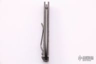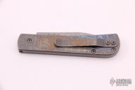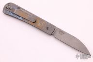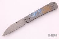This production slipjoint folder by Serge Panchenko features a stonewashed, M390 wharncliffe style blade with nailnick. The handle is blue anodized and stonewashed titanium with a tip up clip. Has a halfstop, flush in all positions. Comes in original packaging. New from maker, laser engraved by Serge.