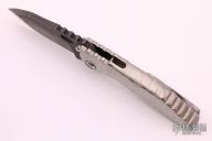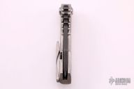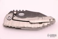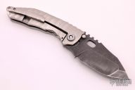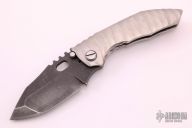 This Draco integral from Dalibor Bergam features an acid washed multi-ground blade, notched thumbrest and thumbhole. The handle is sculpted from a single piece of titanium that has then been orange peel finished and sculpted, tip up clip. The blade is centered when closed, opens/closes smoothly, and locks up with absolutely no play. This piece is in excellent condition.