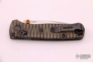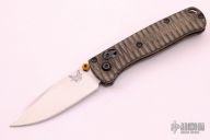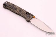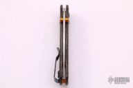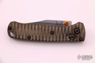 The Mini Bugout features a drop point blade with satin finish. It's a manual opener with ambidextrous thumb studs. This AXIS lock has a FDE frame and black hardware, a black mini deep-carry pocket clip, and a lanyard hole. Orange accents, micarta scale. Excellent Condition.