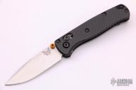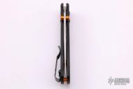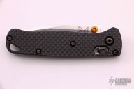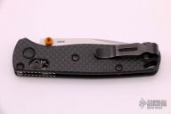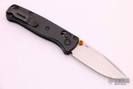 The Mini Bugout features a drop point blade with satin finish. It's a manual opener with ambidextrous thumb studs. This AXIS lock has a FDE frame and black hardware, a black mini deep-carry pocket clip, and a lanyard hole. Orange accents, carbon fiber scales. Has some light scratches, otherwise excellent Condition.