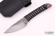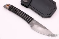This forged kazuyuki by DC Munroe features a hand rub finish tanto blade, .172" blade stock, and 1" blade depth with full tang construction. The handle has a copper lanyard liner, leather wrap. Has a Munroe Metalworks stamp in the ricasso. Comes with handmade leather sheath with soft loop hardware. Also comes with original box and papers. Has some light scratches, otherwise great condition.