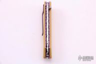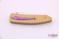 This Scale Release D/A Auto by Thomas Vallotton features a mirror polished blade with fileworked spine and single checkered thumbstud. The handle has Westinghouse paper micarta scales, fileworked and anodized titanium liners, fileworked stainless steel backspacer, tip down anodized and jeweled titanium clip. Nice action, lockup and blade seating. Comes with a pouch. Excellent condition.