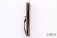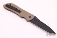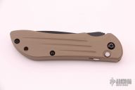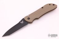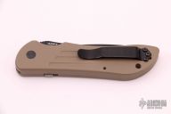 This 9501BK Mini Auto-Stryker from Benchmade features a black coated tanto style blade with notched thumbrest. The handle has a sand colored machined aluminum with black coated stainless steel tip up clip and lanyard hole in pommel.  Excellent condition.