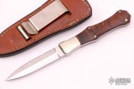 This Boot Dagger by the late Joe Kious features a hand rub satin finished double edged blade with .127" blade stock and .604" blade depth, full tapered tang construction. The handle has dovetailed nickel silver bolsters with wood scales and nickel silver pins. Comes with a brown leather sheath with boot clip. Has a crack in one of the scales, otherwise excellent condition.