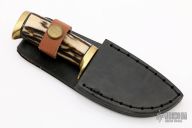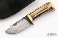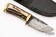 This Babysharp by Murad Custom Knives features a drop point blade with nice hamon and forge finished flats, .168" blade stock and .947" blade depth, hidden tang construction. The handle has a brass guard and butt with a stag grip. Comes with a black leather sheath and COA. New from maker.