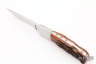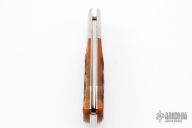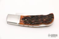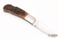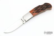 This Lockback from Dave Ricke features a satin finish drop point blade. The handle is comprised of pinched and fluted steel bolsters, jigged bone scales over steel liners and fileworked backspacer. Includes padded and zippered case. Has some scuffs and scratches, otherwise good condition.