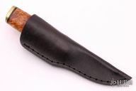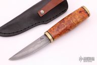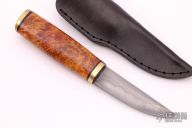 This Custom Pukko by Murad Custom Knives features a drop point blade with nice hamon, .192" blade stock and .990419" blade depth, hidden tang construction. The handle has a brass guard and butt with red amboyna burl wood grip. Comes with a black leather sheath and COA. New from maker.