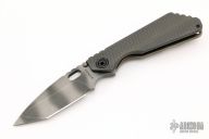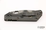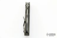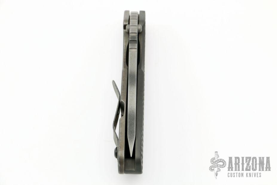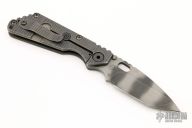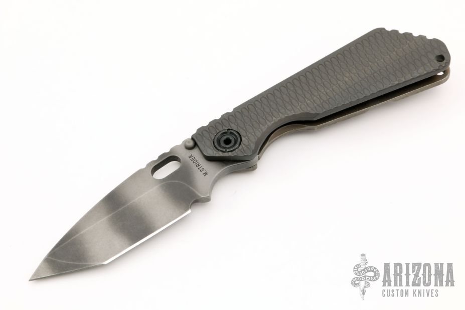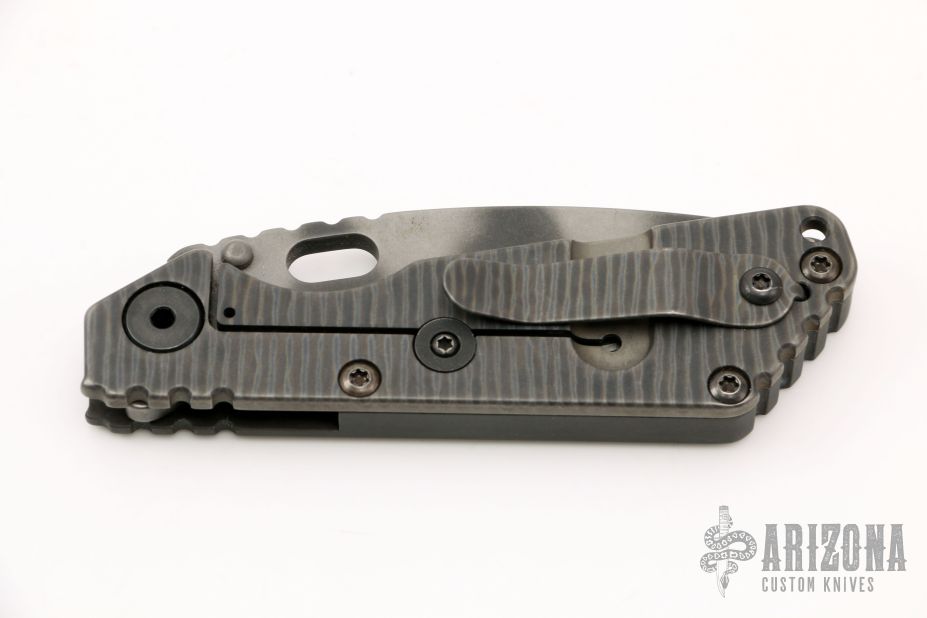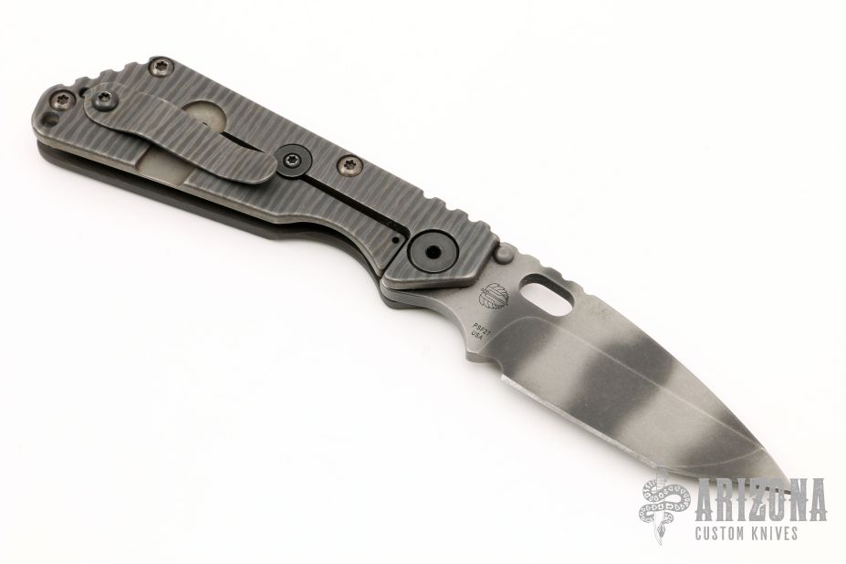 This SNG framelock folder by Mick Strider features a tiger stripe spear point blade and a dimple pattern grey aluminum and flamed titanium frame and tip up titanium clip. Includes a "Lock Bar Stabilizer" for maximum reverse lock retention. Nice detent, lockup and blade seating. Has some light scuffs, otherwise excellent condition.