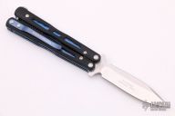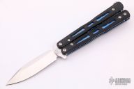 This Model 32 Morpho Balisong Prototype by Benchmade has a machine satin spear point D2 stainless steel blade. Handle is black G-10 with blue anodized titanium liners and milled stainless steel spacers. Blue anodized titanium tip up clip. Blade marked Prototype February 2006. Comes with original box and papers. Excellent condition.