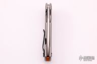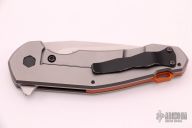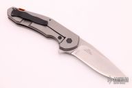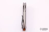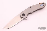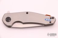 This 0220 Anso by Zero Tolerance features a stonewashed finished drop point blade with notched flipper tab. The handle has bead blasted titanium scale and frame, with a steel lockbar insert. Has an aluminum back spacer with a lanyard hole at the butt, black clip that is reversible. Nice detent, lockup and blade seating. S/N 0501. Has a little wear on the clip, otherwise excellent condition. Comes with original box and papers.