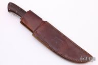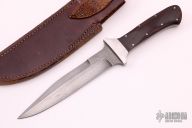 This fighter by Lee Bench Made Knives features a Damascus blade with sharpened top edge, .180" blade stock and 1.195" blade depth, full tapered tang construction. The handle has satin finished stainless steel dovetailed bolsters, cocobolo scales with stainless steel pins. Comes with a brown leather sheath. Has a few light scratches, otherwise excellent condition.