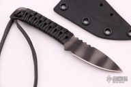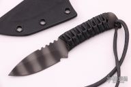 This knife by Mick Strider features a tiger striped blade with notched thumbrest, paracord wrap, .077" blade stock and .896" blade depth, full tang construction with cord wrapped handle. Comes with kydex sheath. New condition.