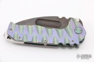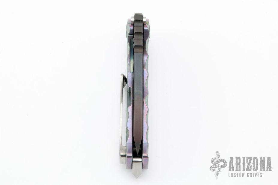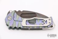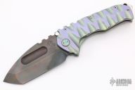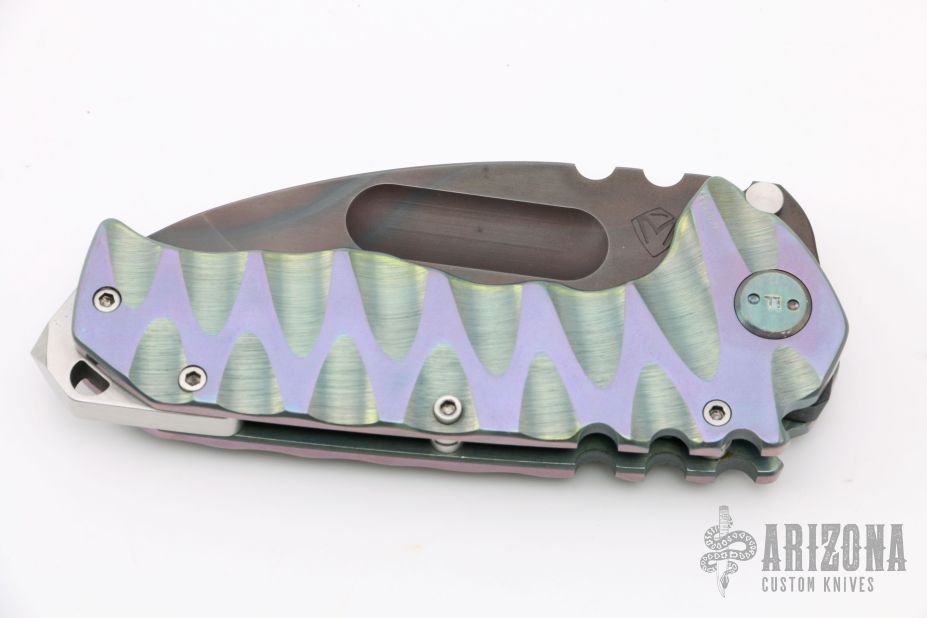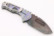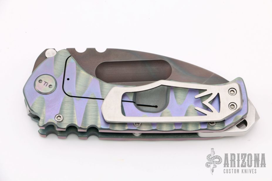The Praetorian is a Marquee knife. It is a TON of blade in a relatively small package. This design incorporates aerospace materials, space age coatings, old school metallurgy, thoughtful design and hand craftsmanship that is rare but alive and strong in this modern world. This knife features a Vulcan finished D2 drop point tanto blade. This particular knife features a carved and anodized finished titanium frame, thick titanium scales, all titanium hardware, and satin titanium clip.   Dead center blade seating. Comes with hard case.  Excellent condition.